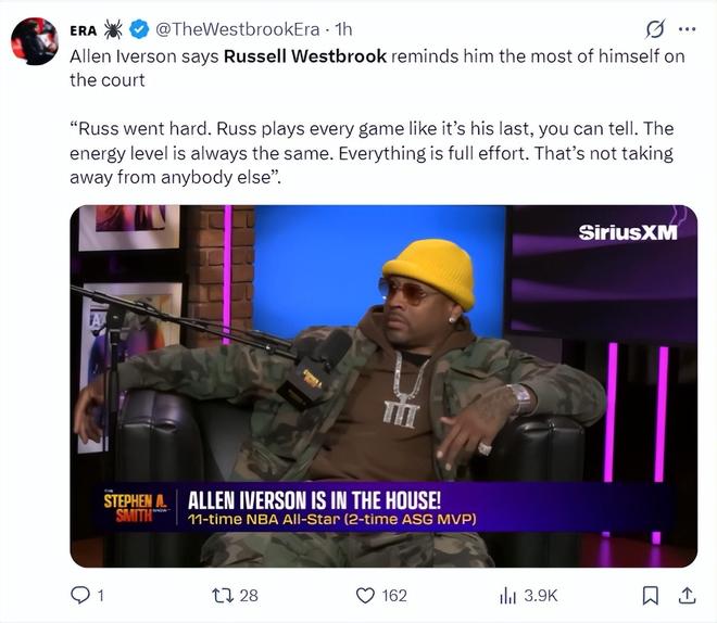 前NBA球星阿伦-艾弗森在一档节目中力挺威少:看到威少在场上就像看到自己,每一场比赛都拼尽全力,他的竞技状态始终如一,全力以赴贯彻到底 ,我并没有感觉他影响到了其他人。